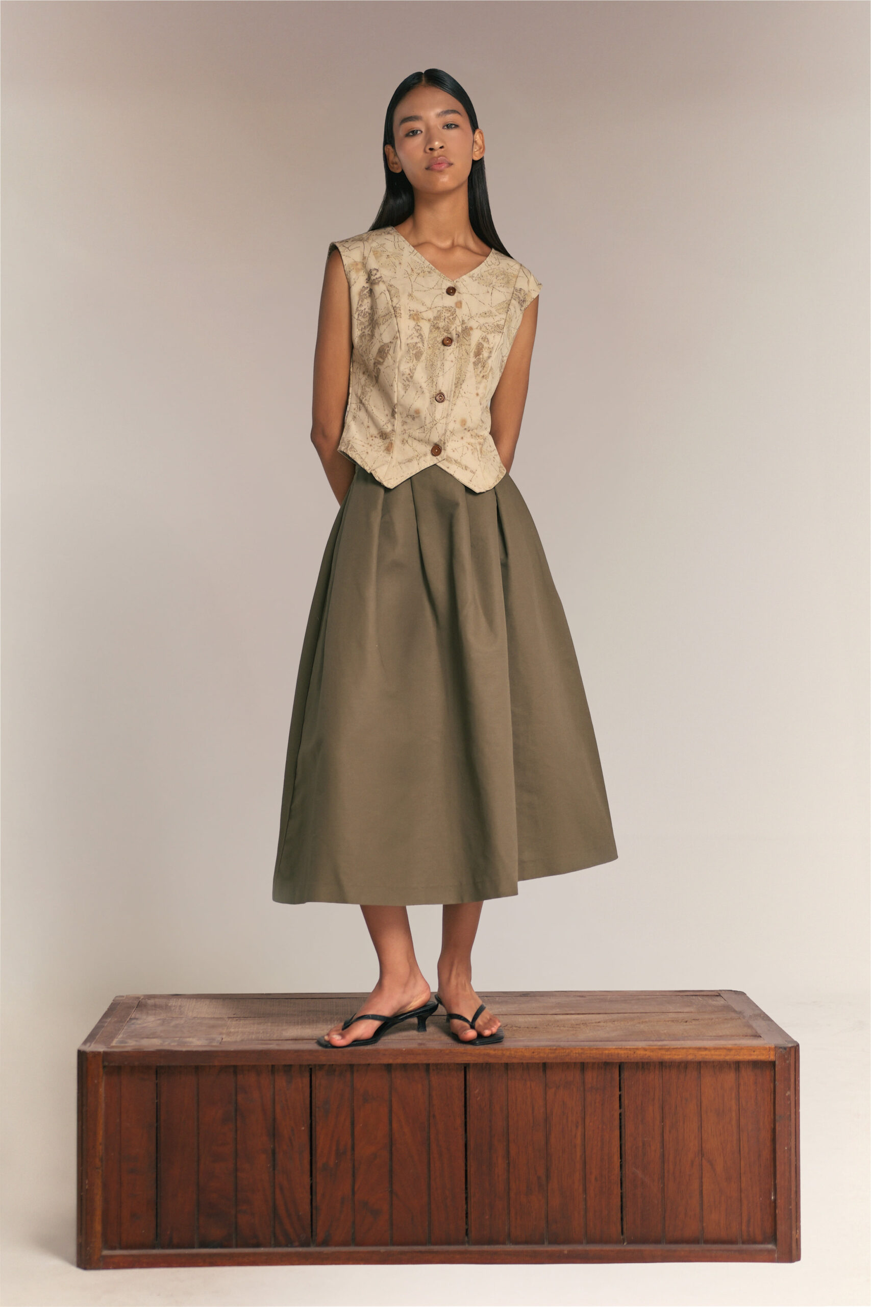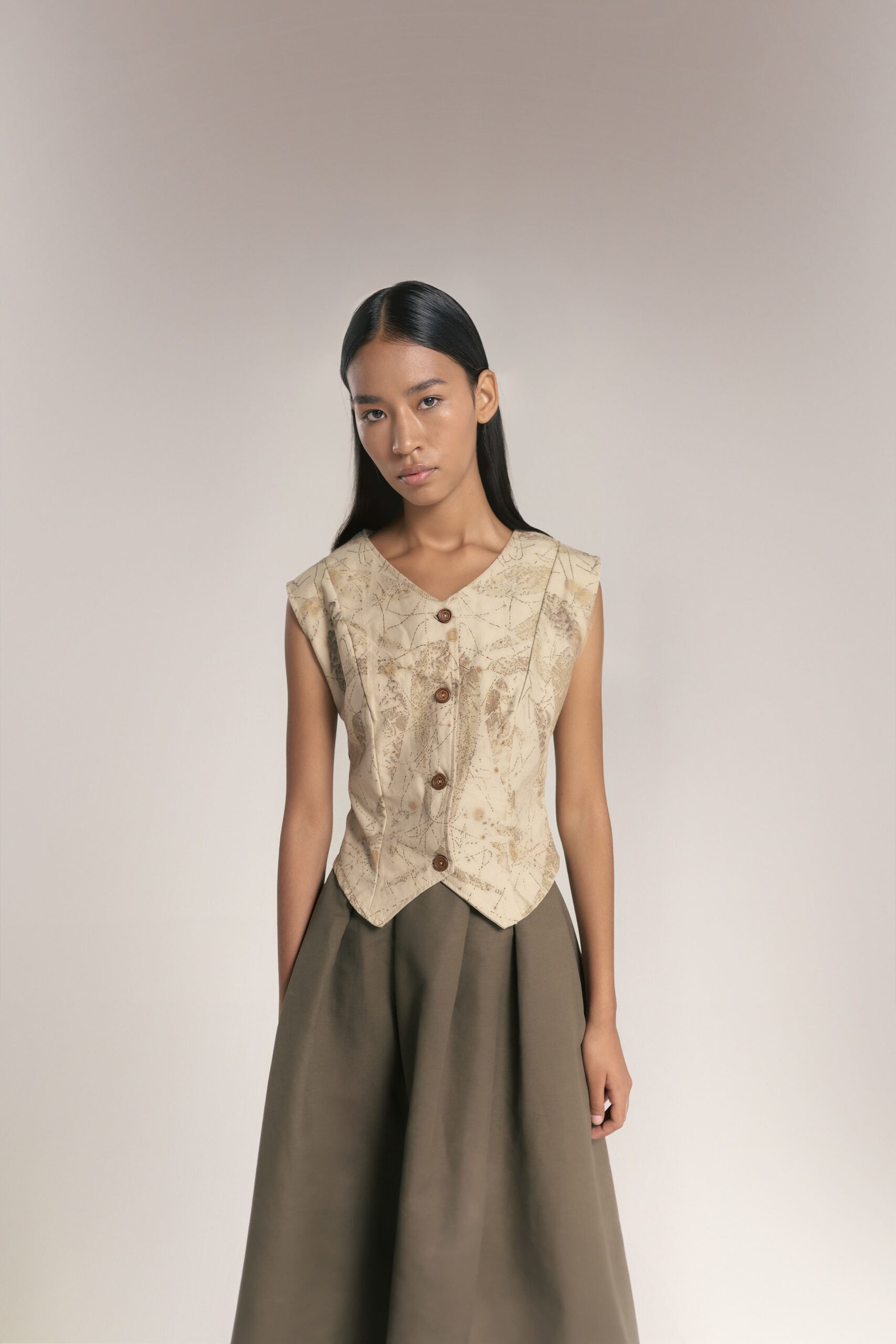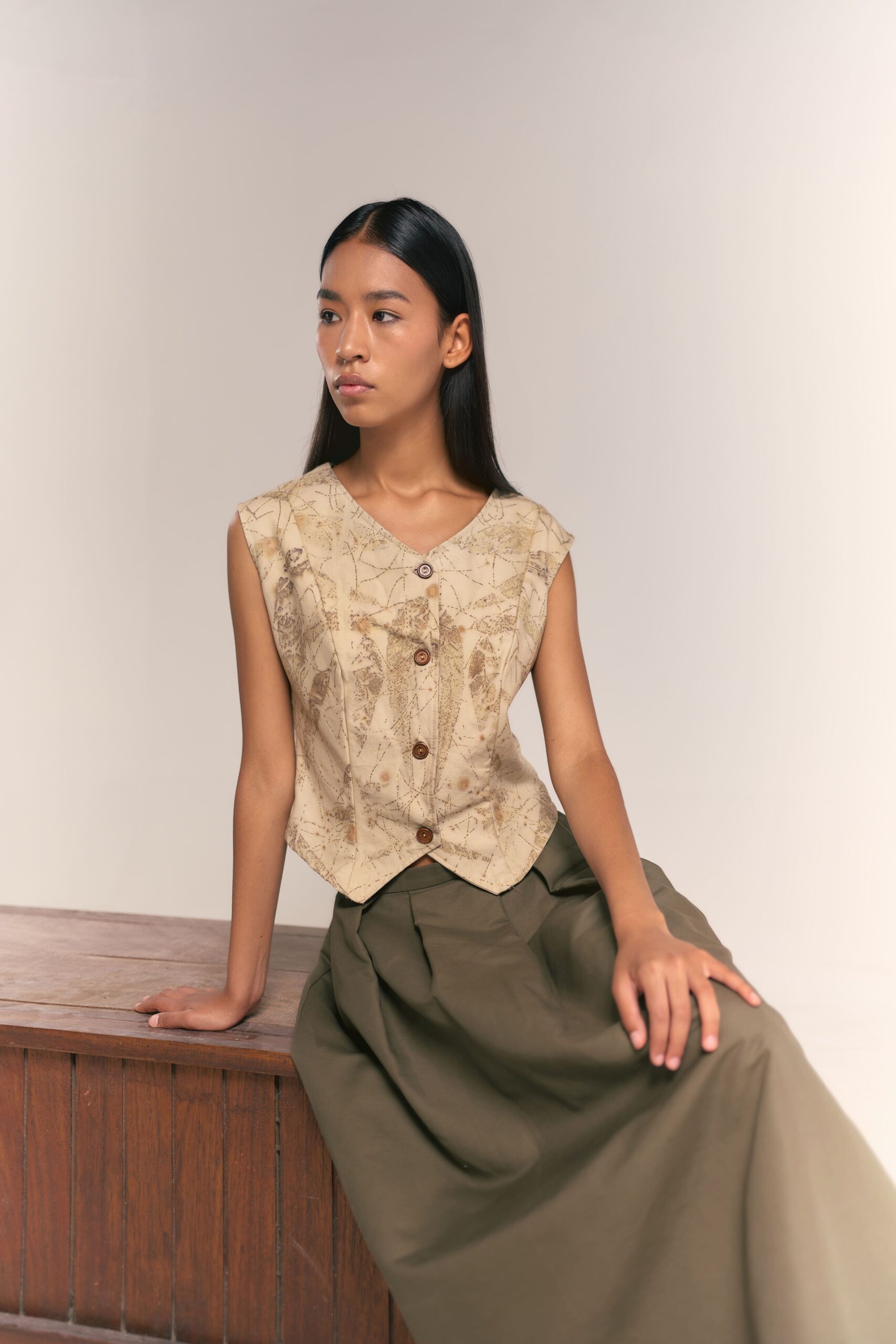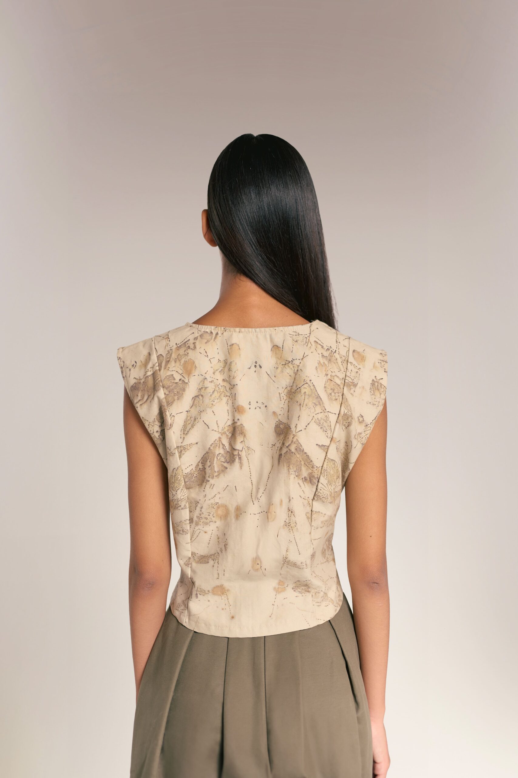 - Estampados de Contraste Profundo: Los tintes oscuros (obtenidos de procesos botánicos) resaltan sobre el fondo claro, convirtiendo cada chaleco en una pieza de arte gráfico natural.